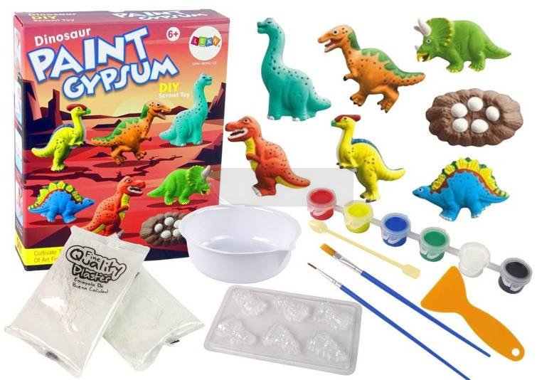 Zestaw DIY Odlewy Gipsowe Malowanie Farby Dinozaury Rozwijanie kreatywności u małych dzieci jest szczególnie istotne w czasie, kiedy zaczynają się integrować z rówieśnikami. Wspólne prace plastyczne wpływają pozytywnie na relacje międzyludzkie oraz uczą dzieci kooperacji. Zabawka nauczy skupienia uwagi na odlewie oraz sprawności łatwego uczenia się i przyswajania wiedzy. Małe elementy ćwiczą precyzję i koordynacje, co zaprocentuje również w szkole. Kolorowy zestaw do tworzenia magnesów na lodówkę to idealna rozrywka zarówno dla młodszych, jak i starszych. Za pomocą znajdującego się w zestawie gipsu można tworzyć małe dinozaury, pomalować według własnego pomysłu, a będą ozdabiać wnętrze. Jak rozpocząć kreatywną zabawę? 1. Gips należy rozrobić z wodą zgodnie z informacjami podanymi w instrukcji, wypełnić nim przygotowane formy, a następnie odstawić do wyschnięcia. 2. Po wyschnięciu stworzonych kształtów można usunąć je z foremek 3. Dowolnie pomalować dołączonymi do zestawu kolorowymi farbkami. 4. Po zakończeniu ozdabiania do kształtów przyklej odpowiedniej długości magnes. Po wykonaniu wszystkich kroków magnesiki własnej produkcji są gotowe! Elementy zestawu to: - foremka z formami w kształcie dinozaurów - dwa opakowania z gipsem - zestaw 6 farbek - pędzelki dwa - łopatka - łyżeczka - płaski, przyklejany magnes o wymiarach 15 cm x 2 cm - instrukcja obsługi zestawu Wymiary jednego gipsu: 7 cm x 3 cm x 2 cm Wymiary opakowania: 23 cm x 18 cm x 5 cm Zabawka przeznaczona dla dzieci powyżej 6 roku życia. Zgodne z certyfikatem CE i zgodne z normą EN71.