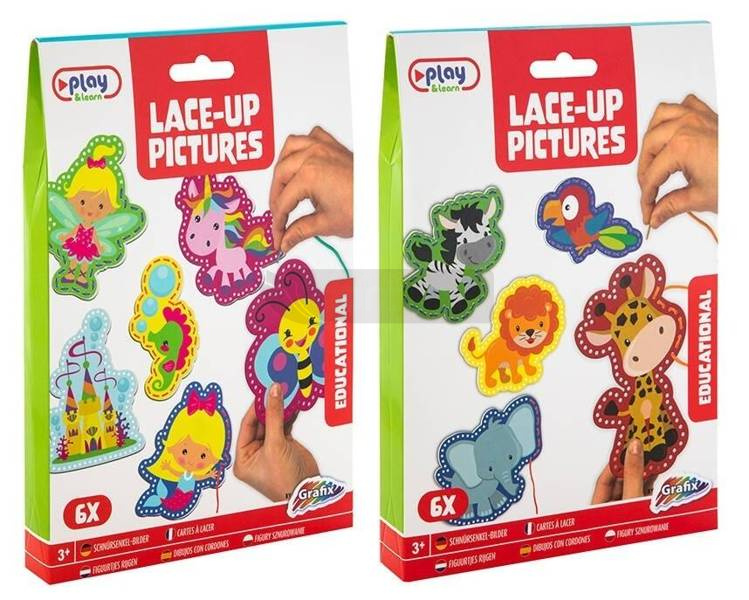 Znajduje się 6 sznurków w różnych kolorach, 6 koronkowych ilustracji (zależy od wariantu). Produkt uczy dzieci wiązania.