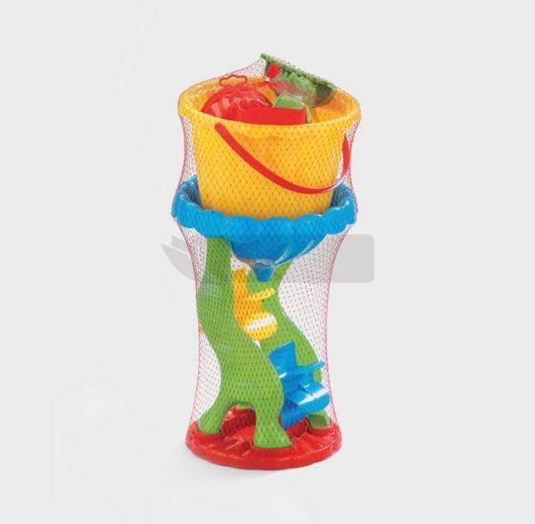 W zestawie 7 elementów; młynek, wiaderko, łopatka, grabki, 3x foremka.