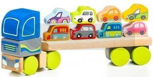 Drewniana ciężarówka z samochodami przeznaczona jest dla najmniejszych zmotoryzowanych. Maszyny umieszczono w rączce, co pozwoli dziecku na spokojny montaż i demontaż wózka. Zasadniczo jest to mini sortownik. Zabawka składa się z 12 części: podstawek z toczącymi się kołami, klocków kabinowych, które składają się w maszynę na zasadzie piramidy (nakładanej na drążek) oraz zestawu 8 małych kolorowych samochodzików.