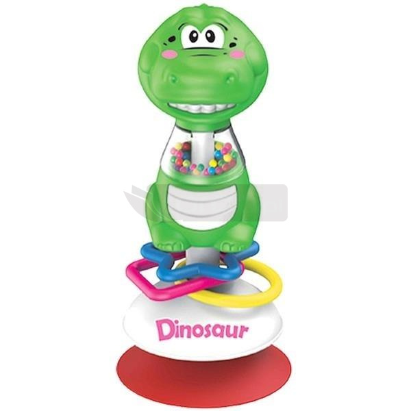 Grzechotka zielony, plastikowy dinozaur z przyssawką, może towarzyszyć dziecku w domu, podczas kąpieli, spaceru i w podróży. Dzięki gumowej przyssawce, można z łatwością przymocować ją do płaskiej, gładkiej powierzchni blatu stołu, podłogi lub krzesełka do karmienia. W tułowiu zwierzaka umieszczono kolorowe kuleczki, grzechoczące przy potrząsaniu. Dodatkowo trzy kolorowe pierścienie, które przyniosą ulgę podczas ząbkowania. Doskonała zabawa i rozwój funkcji rozwojowo-poznawczych. To idealna zabawka dla najmniejszych pociech.