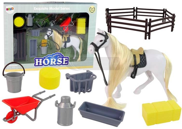 Koń do Czesania Akcesoria Zagroda Siano Stajnia Konie wzbudzają w dzieciach radość i podekscytowanie. Marząc o własnym zwierzęciu, chętnie chcą poznać gdzie żyją, co jedzą. Przedstawiamy przepięknego konika ze wszystkich akcesoriami potrzebnymi, by móc się nim opiekować. Maluch przeniesie się w świat wiejskiego życia, otoczy opieką konia i pozna jego potrzeby. Piękny konik uzupełni kolekcję koni z całego świata. Zabawa w stajnie stanie się jedną z ulubionych zabaw Twojego dziecka. Zapewni wiele godzin cudownej zabawy, pobudzając wyobraźnię oraz zdolności manualne, puszczając wodzę fantazji przeniesie się w świat przygód. Zestaw składa się z figurki konika z długą grzywą, która jest idealna do czesania i zaplatania warkoczy. Po za tym w zestawie znajdują się akcesoria potrzebne do codziennego życia i trzymania porządku w stajni takie jak taczka, grabie. Ale to nie wszystko, trzeba zadbać aby koń miał co jeść i pić, do tego przydadzą się poidła oraz siano. Specjalne ogrodzenie wyznaczy miejsce, gdzie konie będą miały swój wybieg. Rozmiary modeli są idealnie dostosowane do małych rączek. Figurka wiernie oddaje rzeczywisty wygląd zwierzęcia. Elementy zestawu: - koń z siodłem i uzdą - taczka - siano - grabie - widły - wiadro - szczotka - pojemnik na jedzenie i picie x3 - zagroda Zestaw występuje w dwóch wersjach kolorystycznych: - koń brązowy - koń biały Prosimy o informację o wyborze koloru w wiadomości do sprzedającego. Zwierzak zostanie ulubionym towarzyszem lalek! Wymiary figurki konia: 14 cm x 13 cm x 5 cm zagroda- jedna część: 11 cm x 4 cm x 2 cm narzędzia: długość 8 cm Wymiary pudełka: 34 cm x 25 cm x 4 cm Zabawki przeznaczone są dla dzieci powyżej 3. roku życia. Figurki posiadają certyfikat CE i są zgodne z normą EN 71. Zapakowane jest w kartonik, dzięki czemu nadaje się idealnie na prezent.