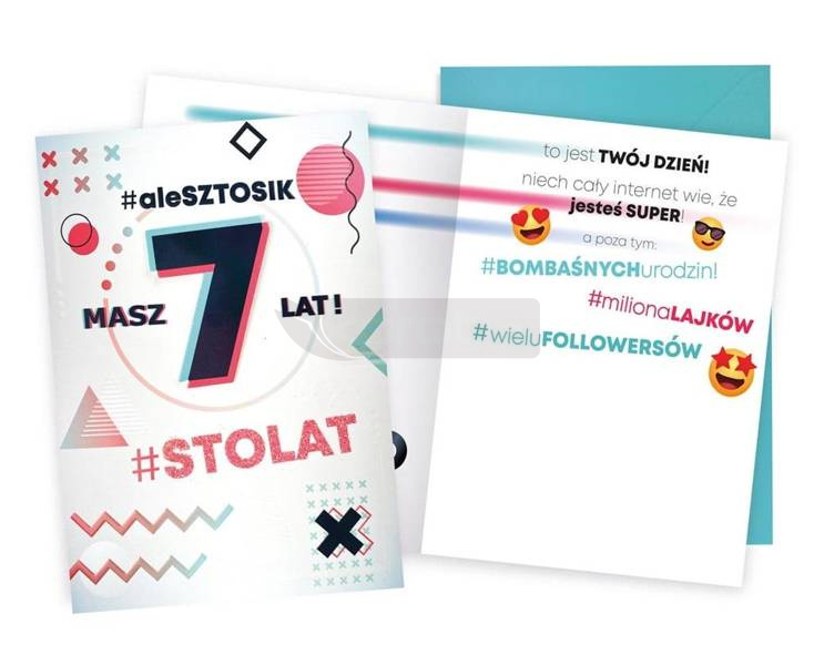 Karnet Dream Cards Plus "Urodziny 7" w powiększonym tzw. Angielskim formacie 140x190 mm. Kartka z ozdobnej serii Dream Cards Plus na siódme urodziny robi wrażenie dzięki atrakcyjnej kolorystyce i ciekawym zdobieniom. To idealny wybór łączący przyjazną cenę z jakością. Cechy szczególne: wielkość: 145 x 195 cm po złożeniu kopertą, wnętrze: kolorowe, wyjątkowe życzenia w środku, w komplecie: dopasowana kolorystycznie koperta. zdobienia: różnorodne, bogate (w zależności od wzoru: przyklejane dekoracje, elementy biżuteryjne, odstawniki, brokat, metaliczne folie, tłoczenia itp.), okazja: urodziny, 7 urodziny