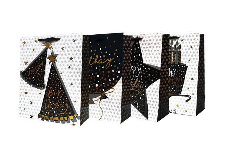 Torebka ozdobna, pionowa, o wymiarach 26x32x10,5 cm. Dostępna w 4 czarno-białych wzorach z metalizowanymi akcentami. Zamiast sznurka znajduje się czarna, ozdobna wstążeczka. Posiada wzmacniany spód.