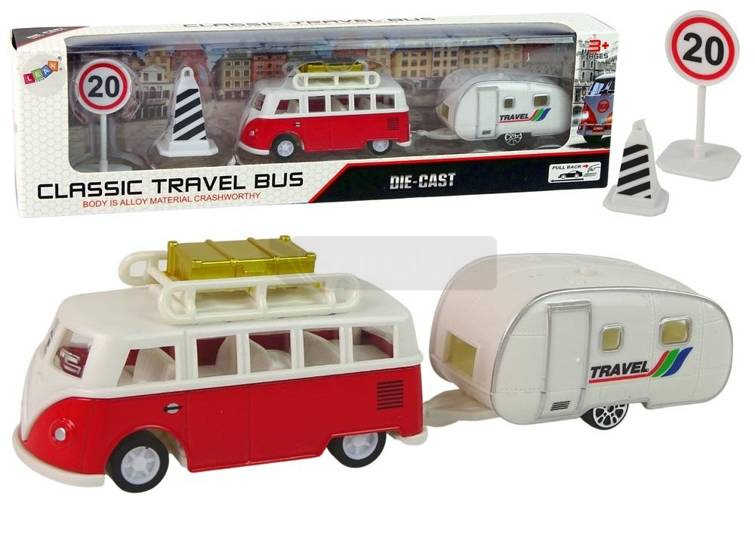 Cały zestaw wykonany został z najwyżej jakości plastiku. Każdy element został idealnie odwzorowany i przypomina prawdziwy odpowiednik. Duży bus w rzeczywistości pomieści grupę osób, środek jest wykonany bardzo realistycznie. Do małego haka można przyczepić małą przyczepę kempingową, która na wycieczkach sprawdza się jako nocleg i małe mobilne mieszkanie. Znaki drogowe, dołączone do zestawu, możesz postawić na trasie busa. Wszystkimi elementy można bawić się razem lub osobno. Wybór należy do Twojego dziecka!