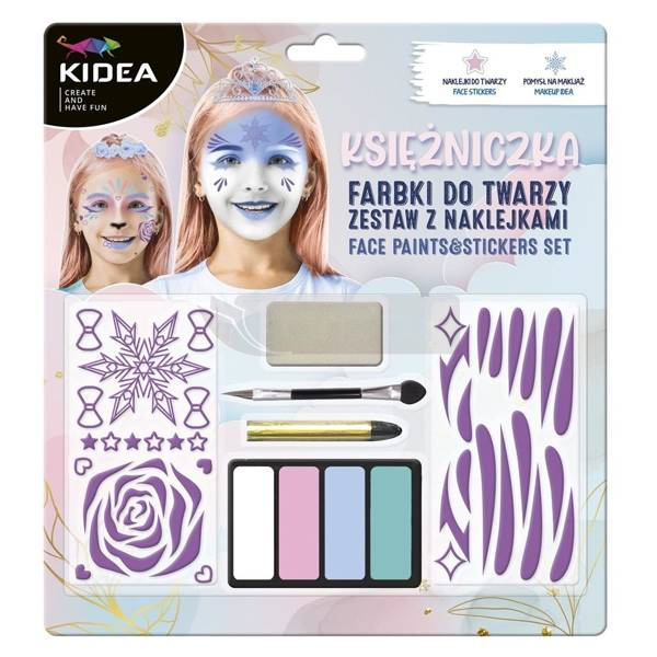 Stwórz makijaż godny prawdziwej księżniczki z farbkami i naklejkami do twarzy KIDEA! W zestawie Księżniczka znajdują się 4 pastelowe farbki, którymi bezpiecznie można malować po skórze, czarna kredka, gąbeczka, dwustronny aplikator oraz naklejki do ciała. Wypróbuj różne stylizacje, użyj naklejek i oczaruj wszystkich swoim bajkowym wyglądem!