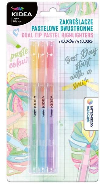 Zakreślacze 2 w 1: jeden zakreślacz dwa kolory! Zestaw trzech zakreślaczy w 6 pastelowych kolorach żółty, zielony, pomarańczowy, niebieski, różowy i fioletowy. Dzięki takiemu rozwiązaniu możemy zaoszczędzić miejsce w piórniku i cieszyć się szeroką gamą kolorystyczną. Modne, pastelowe odcienie doskonale posłużą w oznaczaniu ważnych informacji i sprawią, że notatki staną się bardziej przejrzyste i czytelne. Zakreślacze idealnie sprawdzą się w szkole oraz podczas nauki do egzaminów.