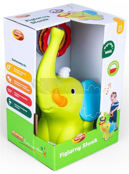 Razem ze Słonikiem ćwicz celność i przekonaj się czy jesteś zwinniejszy od niego! Zabawa polega na wrzuceniu wprost na słoniową trąbę kolorowych obręczy, które znajdują się w zestawie. Żeby nie było tak łatwo, cel jest ruchomy, gdyż słonik przemieszcza się, jeżdżąc we wszystkich kierunkach. Naciśnij na czapeczkę słonika, słuchaj piosenki w języku polskim i... trenuj rzuty!
