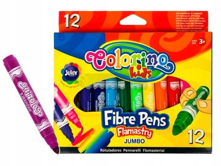 Zestaw 12 soczystych kolorów flamastrów JUMBO z obudową gwarantującą wygodne trzymanie oraz grubą końcówką ułatwiającą rysowanie.