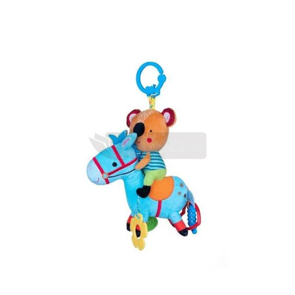 Błękitny konik z zabawnym koalą na grzbiecie to uroczy duet, który rozweseli bobasa. Po naciśnięciu na brzuszek konia, usłyszymy realistyczne odgłosy: rżenie i dźwięk galopu. Do zabawki doczepione są 4 kolorowe gryzaczki oraz wygodny uchwyt, pozwalający na przymocowanie jej w wybranym miejscu.