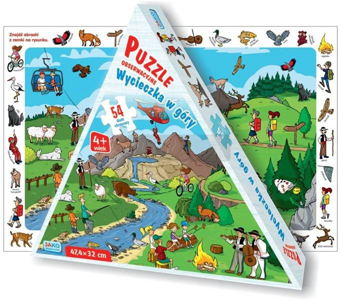 Ilustracja zawiera mnóstwo detali, przedstawia mieszkańców gór oraz turystów wypoczywających w tym malowniczym miejscu. Po ułożeniu puzzli dzieci mogą wykazać się spostrzegawczością i odnaleźć obrazki z ramki na rysunku. Opakowanie zawiera 54 duże elementy które po ułożeniu utworzą obrazek o wymiarach 47,4 x 32 cm. Puzzle są zapakowane w oryginalne, trójkątne pudełko. Układanie puzzli zapewnia doskonałą rozrywkę, a przy tym rozwija wyobraźnię przestrzenną, zdolności manualne oraz pozwala się wyciszyć.