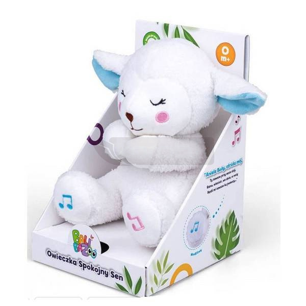 Ta milutka Owieczka pomoże maluchom nauczyć się pierwszych modlitw, Ojcze Nasz i Aniele Boży, a gdy przyjdzie pora snu, zagra miłe dla ucha kołysanki. Poszczególne dźwięki uruchamia się, naciskając na łapki pluszaka: modlitwy - łapkę z niebieską nutką, a kołysanki - łapkę z różową nutką. Aby wyłączyć odtwarzany dźwięk, wystarczy ponownie nacisnąć na wybraną łapkę. Owieczka wykonana została z materiałów o zróżnicowanych fakturach, które stymulują zmysł dotyku maluszka, rozwijając jego zdolności poznawcze. Uszka zwierzaka wesoło szeleszczą przy dotykaniu.