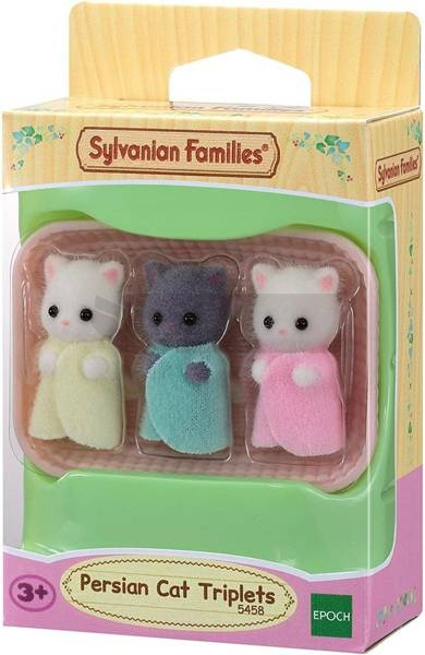 Trojaczki perskich kotków Sylvanian Families to dwie dziewczynki i jeden chłopiec. Prześliczne maluchy Blair, Blake i Briana są częścią rodziny dwubarwnych perskich kotków. Blair ma żółtą chustę, Bake turkusową, a Briana różową. Wszystkie trzy kotki leżą razem w jednym koszyku. Trojaczki perskich kotków Sylvanian Families mają wielkość ok. 3,5 cm, produkt jest przeznaczony dla dzieci od 3 roku życia.
