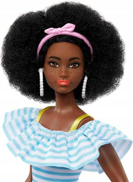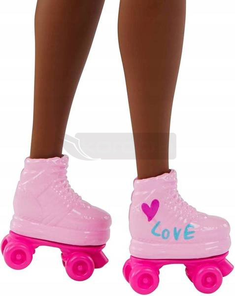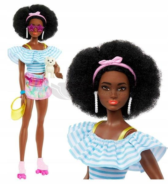 Dzięki oryginalnemu wyglądowi, modnym akcesoriom i szczeniakowi ta lalka Barbie jest gotowa na wszelkiego rodzaju przygody Ma na sobie marszczoną bluzkę z odkrytymi ramionami i pastelowe sportowe szorty. Jej fryzura afro pokazuje jej wspaniałe kręcone brązowe włosy, a u jej stóp nosi urocze różowe rolki Jej strój zdobią kolorowe dodatki: okulary przeciwsłoneczne z soczewkami w kształcie gwiazdek, opaska ozdobiona kokardą, żółty daszek, zegarek i fioletowa saszetka Uroczy szczeniak towarzyszy Barbie na wszystkich jej wycieczkach Od jedzenia lodów z przyjaciółmi po jazdę na rolkach z psem w parku, Barbie ma idealny strój na wszelkiego rodzaju zajęcia Dzieci mogą kolekcjonować różne zabawki Barbie, aby uzyskać jeszcze więcej zabawnych przebrań oraz historii o modzie i przyjaźni. Świetny prezent dla fanów Barbie.