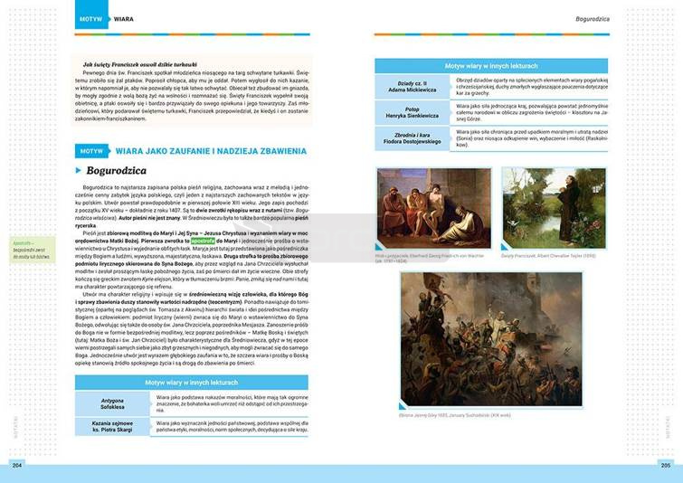 Orientacja w lekturach i sprawne posługiwanie się swoją wiedzą wymaga nie tylko znajomości treści, ale przede wszystkim problematyki. Od przyszłego maturzysty wymagana jest umiejętność przyporządkowywania utworów do związanych z nimi motywów literackich, budowania skojarzeń i dobierania kontekstów. Dlatego też Kompendium... to książka, która prezentuje lektury z podstawy programowej według motywów, kładąc nacisk na zupełnie inne aspekty, niż tradycyjne pomoce edukacyjne. Dzięki niej można nauczyć się problemowego analizowania utworów, szybkiego wybierania potrzebnych do danego tematu lektur, a także swobodnego operowania skojarzeniami i nawiązaniami. Są tutaj też charakterystyki bohaterów i streszczenia (a ich dłuższe wersje można znaleźć pod kodami QR).
