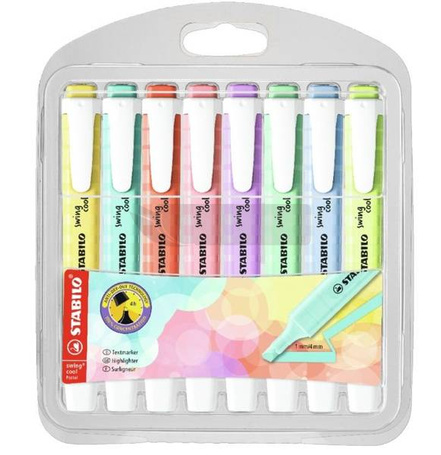 STABILO swing cool Pastel - zakreślacz dla dzieci, młodzieży i osób które podróżują w modnych, pastelowych tonacjach. Kieszonkowy format zakreślacza z praktycznym klipsem do zaczepiania sprawia, że nie zajmuje dużo miejsca więc można go zawsze mieć przy sobie (w torbie, piórniku, kieszeni). Technologia Anti-Dry-Out sprawia, że pozostawiony bez skuwki nawet prze 4 godziny nie zasycha. Grubość linii 1-4 mm. Dostępny w 14 pastelowych kolorach. Plastikowe etui zawierające 8 szt. w kolorach: żółty, turkusowy, różowy, fioletowy, zielony, limonkowy, niebieski, czerwony.