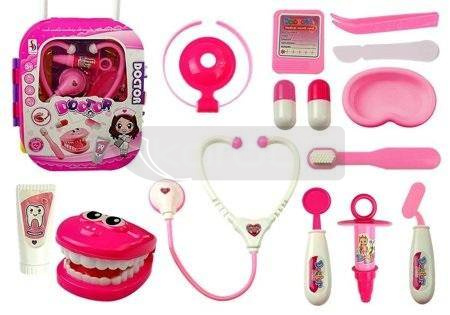 Zestaw Lekarski w Walizce Biały Są dzieci, które już od najmłodszych lat wiedzą, co chcą robić. Jeśli Twoje dziecko leczy wszystkie zabawki i twierdzi, że chce zostać lekarzem, wyposaż je w tę Walizkę Małego Dentysty. Jej bogate, wieloczęściowe wyposażenie i estetycznie wykonane przyrządy lekarskie pobudzą wyobraźnię dziecka i pozwolą mu połączyć fantastyczną zabawę z nauką i rozwojem własnych pasji. Starannie zrobione imitacje prawdziwych narzędzi lekarskich ucieszą dziecko. Wplatanie takich zestawów do zabaw jest również świetną metodą pozwalającą w prosty sposób wytłumaczyć dziecku, że wizyta u lekarza to nic strasznego. Ogromną zaletą zestawu jest jego uniwersalizm. Zabawka może stanowić zarówno walizkę, którą dziecko niesie w rączce jak i w pojazd na kółkach. Zestaw wykonany w kolorze białym. Elementy zestawu lekarskiego: - otwierająca się buzia zwierzątka z zębami - stetoskop - strzykawka - pasta do zębów - szczoteczka do zębów - dwa opakowania imitujące leki - lusterko - pęsetka - plakietka identyfikująca - nożyk - skalpel - miseczka na narzędzia - latarka na czoło - walizka Wymiary elementów zestawu: otwierająca się buzia zwierzątka z zębami: 8 cm x 8 cm x 5 cm stetoskop: długość 45 cm strzykawka: 10 cm pasta do zębów: 8 cm szczoteczka do zębów: 11 cm dwa opakowania imitujące leki: 6 cm lusterko: 11 cm pęsetka: 10 cm plakietka identyfikująca: 5.5 cm x 7 cm nożyk: 9 cm skalpel: 11 cm miseczka na narzędzia: 9 cm latarka na czoło: średnica - 5.5 cm walizka: 32 cm x 25 cm x 11 cm Zestaw lekarski wyprodukowany jest zgodnie z normą EN 71, oznaczono go również certyfikatem CE. Wszystkie elementy wchodzące w skład zestawu zostały wykonane z dbałością o najmniejszy szczegół z najwyższej jakości tworzywa, co jest gwarancją zarówno bezpieczeństwa, jak i komfortu użytkowania. Biały zestaw przeznaczony jest dla wszystkich małych lekarzy powyżej 3. roku życia.