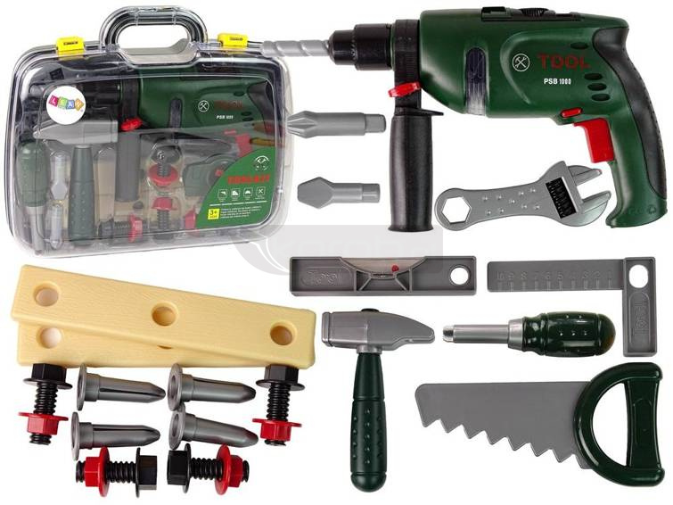 Zestaw Majsterkowicza w Walizce Wiertarka Na Baterie Młotek Szansa na zabawę polegająca na naśladowaniu domowej złotej rączki z pewnością sprawi, że maluch poczuje się odpowiedzialnej. Przedstawiamy komplet narzędzi zamknięty w przezroczystej walizce. Zabawa z prezentowanym zestawem pozytywnie wpłynie na rozwój dziecka -- jego spryt, logiczne myślenie, kreatywność i zdolności manualne. Dłubanie, przykręcanie, odkręcanie jest niezwykle wciągające, oraz rozwija Twoje dziecko na różne sposoby. Nauka nazw i przeznaczenia narzędzi to jedna z zalet zabawy tym zestawem. Cały zestaw zamknięty jest w poręcznej walizce. W środku znajdują się narzędzia, w całości wykonane z plastiku. Wiertarka ma dodatkową rączkę, co umożliwia stabilne trzymanie i precyzyjną pracę. Zasilana jest na baterie, po włożeniu baterii i naciśnięciu przycisku wiertło kręci się i dodatkowo wydaje realistyczny dźwięk. Śrubki, nakrętki czy śrubokręt przydadzą się do złączenia dwóch elementów ze sobą np. drewieńka. Zawsze po skończonej pracy mały majsterkowicz może schować je na swoim miejscu oraz bez problemu mieć je przy sobie. Elementy zestawu: - walizka - drewienko na śrubki - wiertarka - 4 nakrętki - 4 śrubki - piła - 2 wymienne wiertła - młotek - klucz - korek do gipsu x4 - mała poziomica Wymiary wiertarki: 22 cm x 15 cm x 6 cm Wymiary walizki: 34 cm x 30 cm x 10 cm Wymiary opakowania: 36 cm x 32 cm x 12 cm Zgodnie z zaleceniami producenta przeznaczona jest dla dzieci, które ukończyły 3. rok życia. Posiada certyfikat CE.