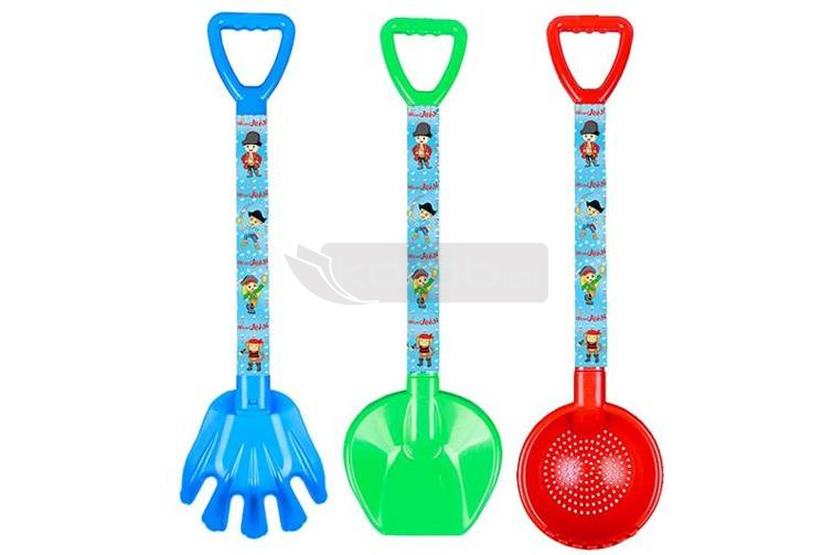 W zestawie: grabki 58 x 16 cm, łopatka 57 x 17 cm, sitko, 59 x 16 cm.