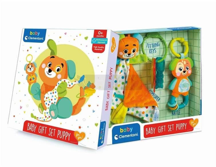 Zestaw ze wszystkim, co niezbędne do powitania nowo narodzonego maluszka: miękka przytulanka, kolorowa grzechotka i klucze-gryzaczki z miękkiego plastiku. Wesołe kolory, dźwięki, ruchome elementy oraz różne materiały dobrano w taki sposób, aby wspomagały multisensoryczny rozwój dziecka.