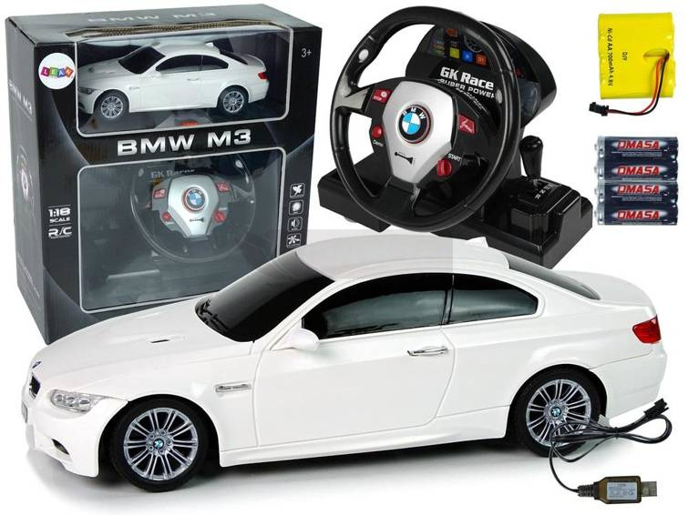 Auto Zdalnie Sterowane BMW M3 Białe 2,4 G Pilot Kierownica 1:18 Dźwięk Światła Jazda własnym autem jest marzeniem wielu osób, a co dopiero sportowym, każdy chłopiec o tym marzy. Przestawiamy zdalnie sterowane auto BMW M3 Białe. Jego kształt i detale zachwycą każdego miłośnika motoryzacji. Pojazd został wykonany w skali 1:18 z każdym najmniejszym szczegółem, dzięki czemu wygląda niesamowicie realnie. Zabawa pomoże rozwinąć w dziecku zdolności manualne, zwinności i sprytu, a dodatkowo polepszy funkcje ręki, co na pewno przyda się w szkole do lekcji pisania. Dużo zalet i świetna zabawa ! Super zaleta jest pilot w kształcie kierownicy, dołączony do zestawu odbiera na częstotliwości 2,4G, co redukuje wszelkie zakłócenia podczas zabawy. Na spodzie posiada przyssawki, maluch może przymocować pilot do stołu i zasiąść za sterami samochodu. Kierownica odpowiada za sterowanie pojazdem a umieszczona przy niej skrzynia biegów pozwala na zmianę kierunku jazdy w przód, w tył oraz ustawienie biegu neutralnego (wyłączenie napędu). Dodatkowe funkcje to odpalenie, efekty dźwiękowe jak klakson i utwory. Wyświetlacz na kierownicy po zmianie biegu podświetla odpowiedni bieg. Rozpocznij jazdę w zaciszu swojego pokoju! Kolor biały pojazdu wyróżnia pojazd na tle innych. Świecące reflektory przód- tył dodają realizmu, dzięki czemu poczujesz, jakbyś prowadził prawdziwe auto. Elementy zestawu: - pilot 2,4 GHz - auto BMW - ładowarka USB - bateria 4,8 V 700 mAh - 4 baterie 1,5 V AA Wymiary pojazdu: 23 cm x 10 cm x 7 cm Wymiary pilota: 20 cm x 17 cm x 12 cm Wymiary pudełka: 35 cm x 37 cm x 17 cm Auto zasilane jest baterią 4,8 V 700 mAh, które są dołączone do zestawu. Do pilota należy użyć 4 baterii "AA" 1,5 V (w zestawie). Zabawka przeznaczona jest dla dzieci powyżej 8 roku życia. Zestaw posiada certyfikat CE i jest zgodny z normą EN 71. Zapakowany jest w kartonik z przezroczystą witrynką, dzięki czemu nadaje się idealnie na prezent.