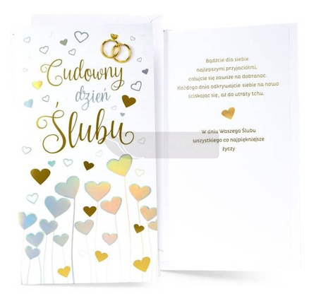 Każda kartka w kolekcji Passion Moments to małe arcydzieło - wyjątkowe i niepowtarzalne, piękne wizualnie. Kartki PM są bardzo bogato zdobione, a jednocześnie skromne i stylowe, cały efekt tkwi w detalach i doskonałym wykonaniu. W zależności od wzoru, na kartkach znajdują się dekoracje ze złotej, srebrnej, perłowej lub holograficznej folii, a także doklejki biżuteryjne, kokardki, brokat, laserowe wycięcia, wstążeczki i inne dodatki. Wnętrze karnetu to zawsze atrakcyjna grafika i tekst życzeń. Kartki mają w komplecie dopasowaną kopertę. Cechy szczególne: zdobienie: przynajmniej dwie folie (metaliczne/perłowe/holograficzne), brokat, elementy doklejane, wycięcia laserowe, wstążeczki - w zależności od wzoru, wnętrze: z delikatną grafiką, wyjątkowe życzenia w środku, w komplecie: dopasowana kolorystycznie koperta, okazja: Ślub Wymiary karnetu po złożeniu: 11,4 x 21,5 cm.