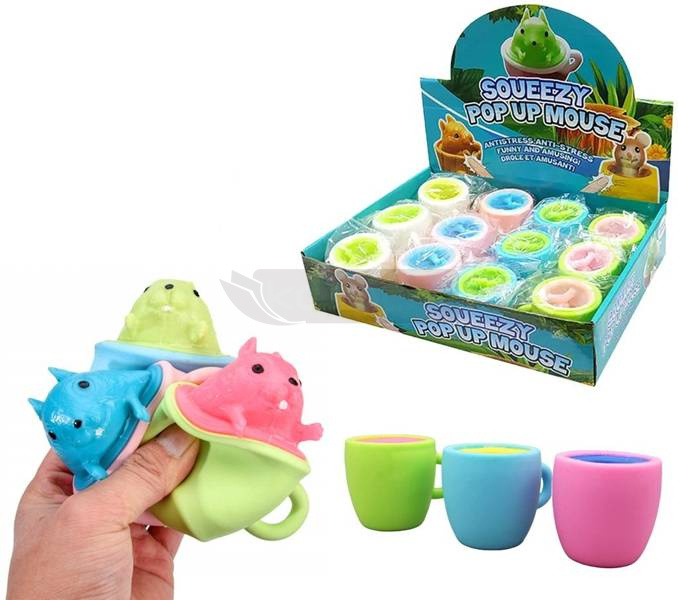 Miękki, gumowy gniotek. Po zgnieceniu filiżanki z jej wnętrza wychodzi myszka.