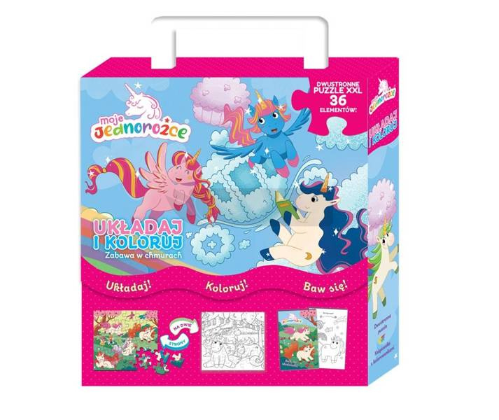 Oto pudełko pełne zabawy z Jednorożcami! Wewnątrz znajdziesz książeczkę z malowankami oraz dwustronne puzzle. Ułóż obrazek z magicznymi stworzeniami, a potem odwróć układankę i pokoloruj scenkę według własnego pomysłu.