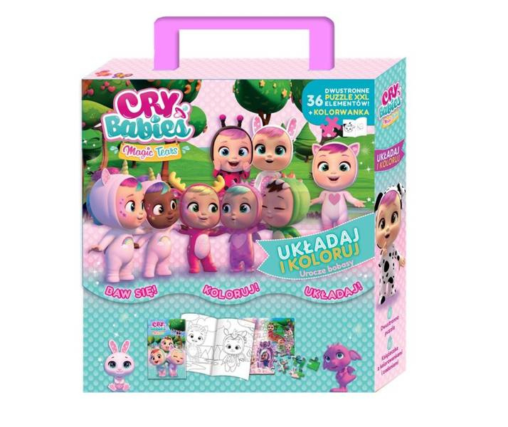 Oto pudełko pełne zabawy z Cry Babies! Wewnątrz znajdziesz książeczkę z malowankami oraz dwustronne puzzle. Ułóż obrazek z bohaterami bajki Cry Babies, a potem odwróć układankę i pokoloruj scenkę według własnego pomysłu.