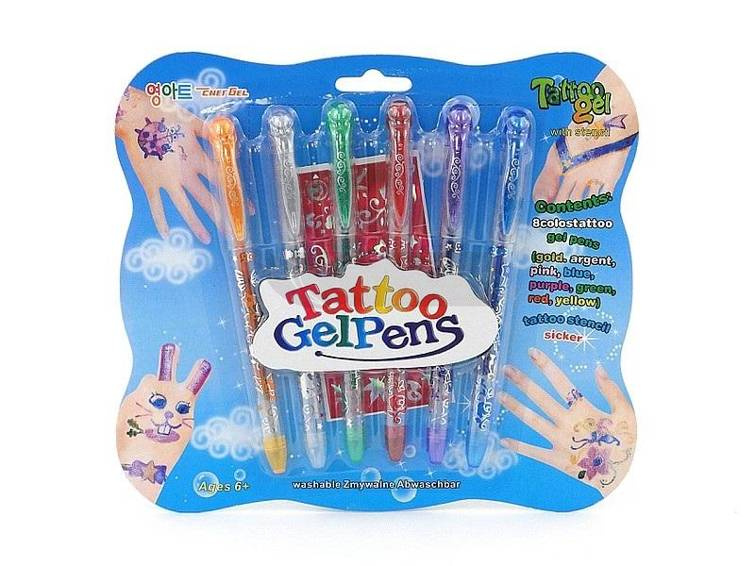 Długopisy kolorowe do tatuaży, 6 kolorów, brokatowe.