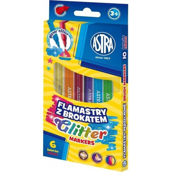 Flamastry są przeznaczone do kolorowania, rysowania i pisania na papierze. Efekt brokatu! Doskonała jakość. Cienka końcówka typu fine. Nasycone intensywne kolory. Wentylowana skuwka. Ilość: 6 sztuk.