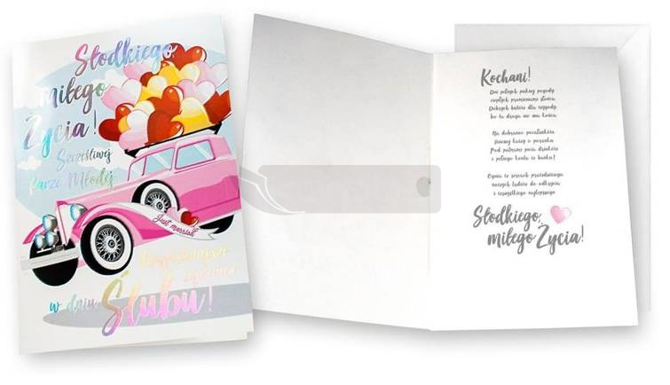 Kartka muzyczna na Ślub MP-0035. Kartki z serii Simfonica wyróżniają się nie tylko wielkością i pięknym wzorem, ale także niespodzianką w środku - po otwarciu kartki uruchamia się znane muzyczne nagranie "Słodkiego miłego życia z repertuaru zespołu Kombi Wymiary karnetu po złożeniu: 15cm x 22,5 cm, zdobiony w zależności od wzoru złotą folią lub cholograficzną. Każda kartka posiada życzenia w środku i kopertę.