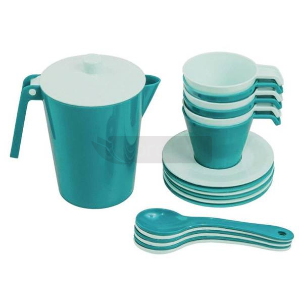 Serwis kawowy z serii Toys in Trends w kolorze nasyconego turkusu, mlecznej mięty oraz bieli to niezastąpiona zabawka dla każdego dziecka, które lubi bawić się w odgrywanie ról. Idealnie nadaje się na kameralne spotkanie na herbatkę dla 6 osób, a mała gospodyni będzie mogła w zabawny sposób nauczyć się zasad etykiety i nakrycia stołu. Zestaw składa się z 19 elementów: dzbanka, 6 filiżanek, 6 talerzyków, 6 łyżeczek. Zestaw jest starannie wykończony i bezpieczny w użytkowaniu - naczynia są dopuszczone do kontaktu z żywnością, można używać ich w kuchence mikrofalowej i myć w zmywarce.
