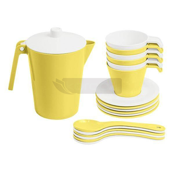 Serwis kawowy z serii Toys in Trends w kolorze żółto-biało-szarym to niezastąpiona zabawka dla każdego dziecka, które lubi bawić się w odgrywanie ról. Idealnie nadaje się na kameralne spotkanie na herbatkę dla 6 osób, a mała gospodyni będzie mogła w zabawny sposób nauczyć się zasad etykiety i nakrycia stołu. Zestaw składa się z 19 elementów: dzbanka, 6 filiżanek, 6 talerzyków, 6 łyżeczek. Zestaw jest starannie wykończony i bezpieczny w użytkowaniu - naczynia są dopuszczone do kontaktu z żywnością, można używać ich w kuchence mikrofalowej i myć w zmywarce.