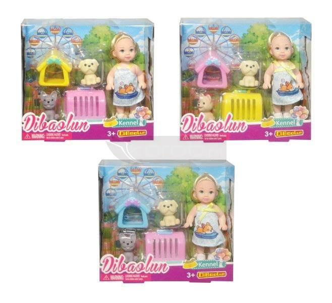 Mała laleczka w zestawie z 2 rodzajami kolorowych piesków. W zestawie dołączono również akcesoria dla pupili takie jak: buda i transporter. Produkt występuje w kilku wersjach kolorystycznych, wybierany losowo. Cena dotyczy jednej sztuki. Produkt zapakowany w kartonowe opakowanie z przezroczystym okienkiem. Zabawka dla dzieci od 3 lat. Podane wymiary są wymiarami opakowania.