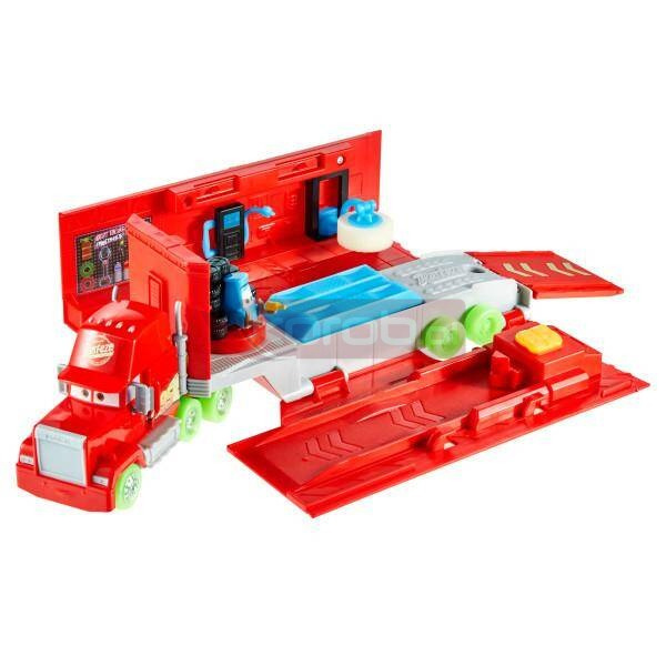 Cars Auta Glow Racers Maniek Świecący w ciemnościach Zestaw 2w1 z pojazdem oraz centrum serwisowym z wyrzutnią i windą