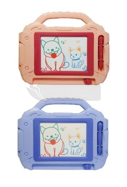 Znikopis pisania i rysowania. Znikopis w zestawie posiada również długopis. Malunki można łatwo usunąć, przesuwając suwak zmazujący. Zabawka przeznaczona dla dzieci w wieku powyżej 3 lat. Produkt występuje w kilku wersjach kolorystycznych, wybierany losowo. Cena dotyczy jednej sztuki. Podane wymiary stanowią wymiar opakowania. Produkt zapakowany w przezroczysty worek.