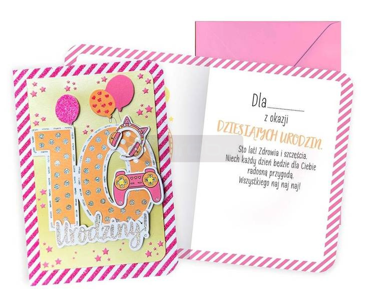 Kartka B6 z ozdobnej serii Dream Cards na Urodziny dziecięce - nieduża, ale robi wrażenie dzięki atrakcyjnej kolorystyce i ciekawym zdobieniom.