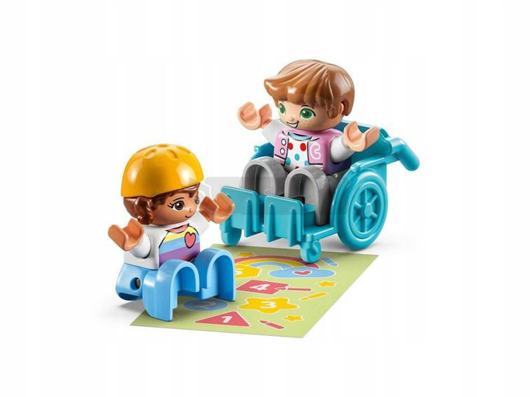 Klocki LEGO Duplo 10992 - Dzień z życia w żłobku Dzięki zestawowi LEGO® DUPLO® Dzień z życia w żłobku (10992) maluchy w wieku od dwóch lat mogą bawić się z przyjaciółmi. Ten edukacyjny zestaw pozwala dzieciom odgrywać codzienne czynności, a jednocześnie uczyć się liczb i kolorów. Pełen realistycznych detali Zestaw jest pełen kreatywnych zajęć, które pozwalają rodzicom i dzieciom odgrywać scenariusze zabaw grupowych, zupełnie jak w prawdziwym żłobku. Dzieci mogą malować palcami w kąciku plastycznym lub zjeść przekąskę. Figurka na wózku inwalidzkim może zjechać po rampie, aby dołączyć do swoich przyjaciół, którzy śmigają po podwórku na hulajnodze. Rodzice mogą również uczyć pociechy, jak ważne jest mycie rąk w łazience, w której znajduje się toaleta i umywalka. Elementy pobudzające zmysły Podobnie jak wszystkie zabawki LEGO DUPLO, ten zestaw zawiera klocki w jaskrawych kolorach, które zachęcają dzieci do ich podnoszenia i budowania, a materiałowa mata z liczbami dodaje element sensoryczny. Zestawy LEGO DUPLO pomagają dzieciom zrozumieć otaczający je świat, przedstawiając znane im miejsca i bogatą różnorodność postaci.