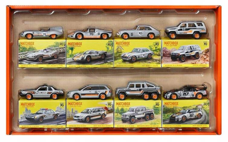 Zamknięte opakowanie premium ma klasyczny design, aby uhonorować dziedzictwo Matchbox. Ten kolekcjonerski pakiet premium, świętujący 70. rocznicę firmy Matchbox, zawiera osiem pojazdów w skali 1:64. Odlewany pojazdy z okazji 70. rocznicy są pokryte platynowym lakierem, wyróżniają się szczegółowymi dekoracjami, metalową konstrukcją i oponami True Grip. Niektóre mają również ruchomą część, taką jak otwierane i zamykane drzwi, pokrywa bagażnika lub klapa silnika. Zestaw zawiera 8 odlewanych pojazdów, w tym 1 wyjątkowy pojazd, i jest idealny dla kolekcjonerów.