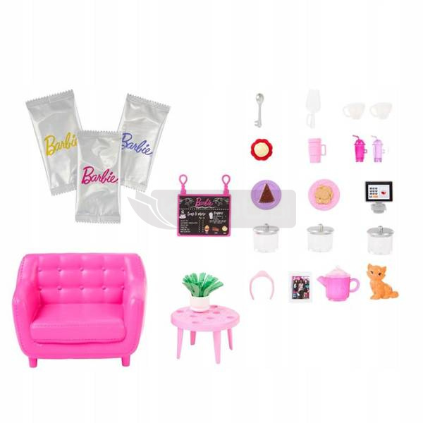 Dzięki temu zestawowi do zabawy Barbie dzieci mogą znaleźć w przytulnej kawiarni Barbie. Zestaw do zabawy obejmuje lalkę, meble i 21 akcesoriów do opowiadania historii, jeden z nich nawet z efektem zmiany koloru Lalka Barbie nosi różową opaskę na włosy w swoich długich blond włosach i nosi czarującą sukienkę z nadrukowanymi liśćmi i różowymi butami. Barbie ma słodkiego kota, który lubi się z nią bawić Można złożyć zamówienie przy ladzie i czytać magazyn w jednym z foteli na sofie lub samodzielnie stać się baristą i przygotować pyszne napoje Dzieci mogą wybrać kolor rozpuszczalnego papieru (niebieski, czerwony lub żółty) i dodać łyżeczkę do dzbanka do herbaty z efektem zmiany koloru. Dodaj wodę i już można przygotować napoje. Nawet sam dzbanek do herbaty zmienia kolor, gdy jest napełniony lodowatą wodą Świetny prezent dla fanów Barbie.