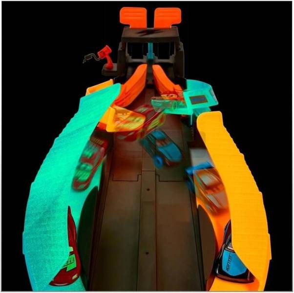 Czas na niezapomnianą rozgrywkę z zestawem Nocny wyścig Tor świecący w ciemności! Ten niezwykły tor zapewnia dwie różne formy zabawy. W dzień dziecko może wystartować oba samochodziki i ścigać się na prostej, a w nocy wykonywać nieprawdopodobne akrobacje na skrzyżowaniu toru. Teraz nie trzeba czekać fotofinisz - zwycięzca aktywuje flagę w szachownicę! Dodatkowo wiele elementów zestawu oraz oba pojazdy Glow Racers świecą w ciemności, co tworzy niesamowity efekt i dodaje dreszczyku emocji.