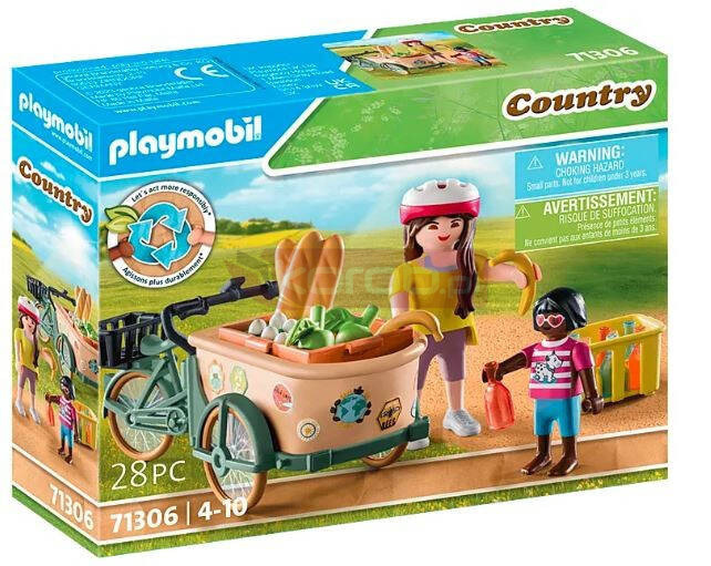 28-częściowy zestaw zawiera dwie figurki PLAYMOBIL, rower towarowy z wymienną skorupą transportową, skrzynkę na warzywa, skrzynkę na napoje z butelkami i inne dodatki.