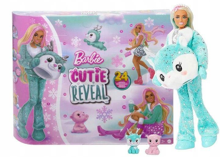 Ten wspaniały kalendarz adwentowy Barbie z 24 niespodziankami zainspiruje małe dziewczynki do zabawy. Odliczaj dni do Świąt Bożego Narodzenia z tym niesamowitym kalendarzem adwentowym. Dzięki 24 uroczym niespodziankom kalendarz adwentowy Barbie Cutie Reveal zapewnia dziecku fantastyczną zabawę. Dzieci będą się dobrze bawić, odkrywając codziennie nowy przedmiot o tematyce zimowej! Odkryj śliczną śnieżynkę błyszczącego jelenia — odkryj lalkę Barbie pierwszego dnia, a kilka dni później rozpakuj kostium srebrnego jelenia i najsłodsze zimowe stroje! Kontynuuj rozpakowywanie, aby uzyskać więcej zimowych słodkości, takich jak mitenki, buty i ubrania o tematyce śnieżnej. Wystylizuj lalkę za pomocą nakrycia głowy, biżuterii i innych błyszczących akcesoriów. Dzieci mogą tworzyć na swojej lalce wyjątkowe kombinacje uroczych stworzeń! Odkryj więcej zabawnych zimowych niespodzianek, w tym 2 urocze mini-zwierzaki z akcesoriami i zmieniającymi kolor oczami, które „otwierają się i zamykają” pod wpływem lodowatej lub ciepłej wody! Odkryj zimową krainę czarów z dodatkowymi prezentami, takimi jak aparat fotograficzny, kubek, śniegowce i świąteczne ciasteczka. Kalendarz adwentowy Barbie Cutie Reveal to świetny prezent dla dzieci w wieku od 3 lat, które mogą łączyć i dopasowywać akcesoria i mieć niekończącą się zimową zabawę!