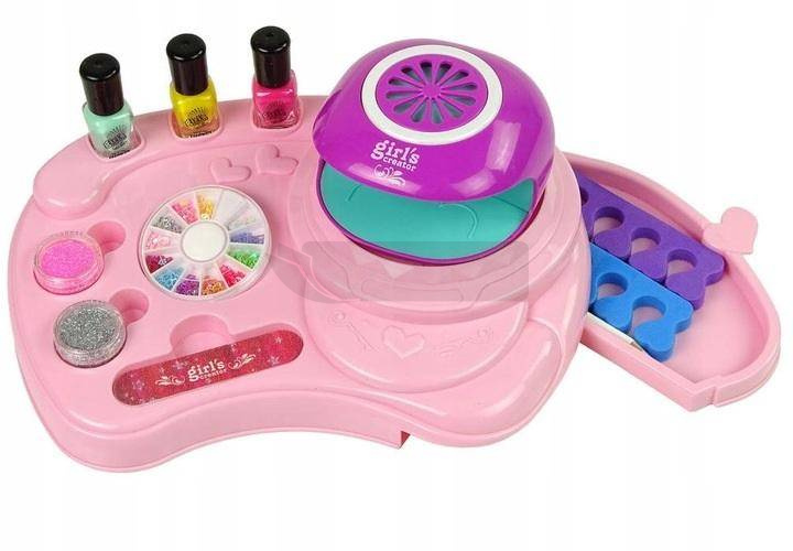 Studio paznokci zawiera: - 3 kolorowe lakiery i 2 brokaty - 2 separatory ułatwiające dekoracje paznokci - Pilnik - Mnóstwo ozdobnych naklejek w różnych kolorach i wzorach - Funkcjonalna suszarka z podświetleniem (2 x AA, zestaw nie zawiera) - Nauka zręczności, koordynacji i cierpliwości - Już od 6 roku życia
