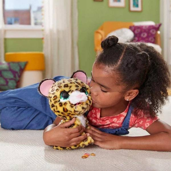 Kto nie chciałby mieć lamparta jako zwierzaka? Lampart Lolly furReal to interaktywna i egzotyczna pluszowa zabawka, która uwielbia być karmiona przez dzieci. Oczywiście lubi też się bawić i przytulać. Kotka lamparta można nakarmić swoimi 5 smakołykami, które następnie zsuwają się po zjeżdżalni i wysuwają się z klapki na tyłek, którą można otworzyć. Wtedy zabawa zaczyna się od nowa! Słodki lampart Lolly szczególnie lubi być głaskany, a następnie wydaje ponad 40 odgłosów i reaguje, takich jak lizanie, zabawne dźwięki i oczywiście ryczy, ponieważ już ćwiczy, by zostać dużym dzikim kotem. Ponadto Lolly jest totalnie przytulaśna i uwielbia się przytulać i przytulać.