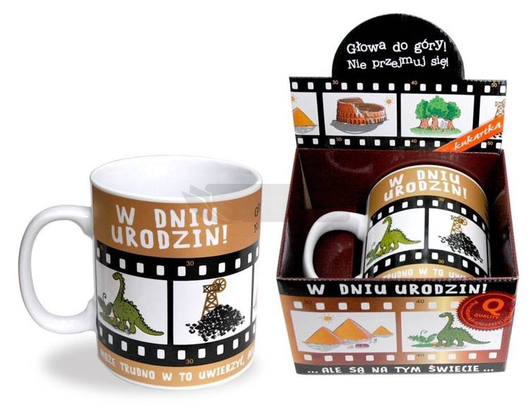 Kubek Gigant "W dniu urodzin" G-044 Kubki Giganty Kukartka to wyjątkowy produkt na rynku - są duże, piękne, zabawne i praktyczne. Każdy prawdziwy facet marzy o takim kubku, który eliminuje konieczność niepotrzebnego wstawania po dolwekę np.. od komputera. Każdy duży kubek ma specjalne, dedykowane do wzoru opakowanie, które można rozłożyć, aby zaprezentować kubek w środku. Wszystkie Giganty są zdobione w podpoznańskiej fabryce Kukartki, więc kupując je, wspieracie polskich producentów. Cechy szczególne: Typ produktu: duży kubek Gigant, Materiał: porcelana, Opakowanie: dekoracyjny, rozkładany kartonik dedykowany do wzoru, Pojemność 700ml, Okazja: urodziny