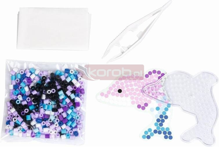 Opakowanie zawiera koraliki do zaprasowywania, z których można wykonać dwa motywy na dołączonej podkładce. Zestaw zawiera również pęsetę, papier do zaprasowywania oraz instrukcję.