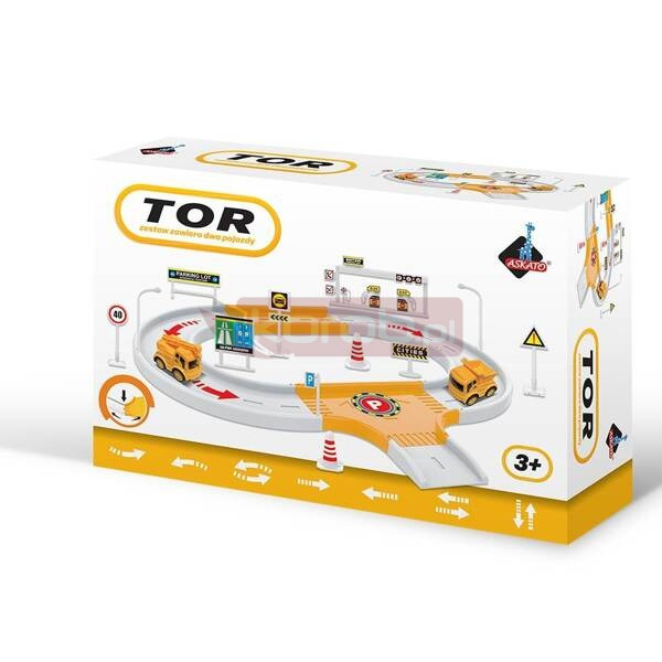 Tor samochodowy w zestawie z dwoma autami budowlanymi, znakami drogowymi, lampami, stacją benzynową. Wymiary rozłożonego toru - 44 x 37 cm Wymiary opakowania: 28 x 7 x 19 cm