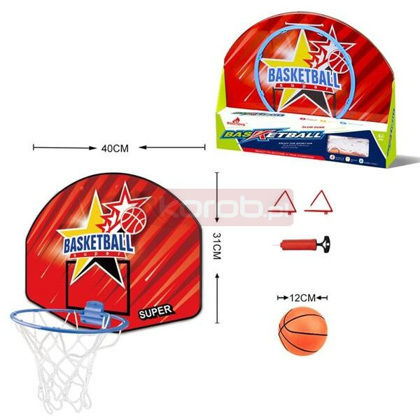 Mała tablica do kosza z obręczą z siatką, pompką i piłką w zestawie. Piłka o średnicy 12 cm. Wymiary opakowania: 40.5 x 6 x 31.5 cm